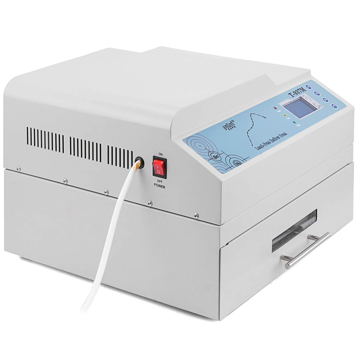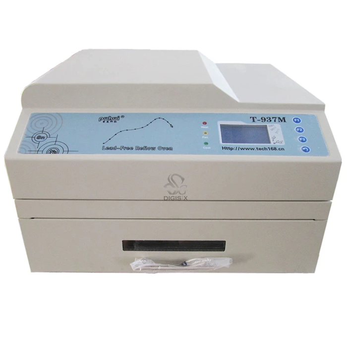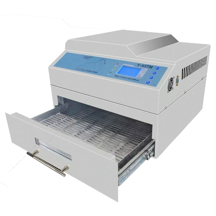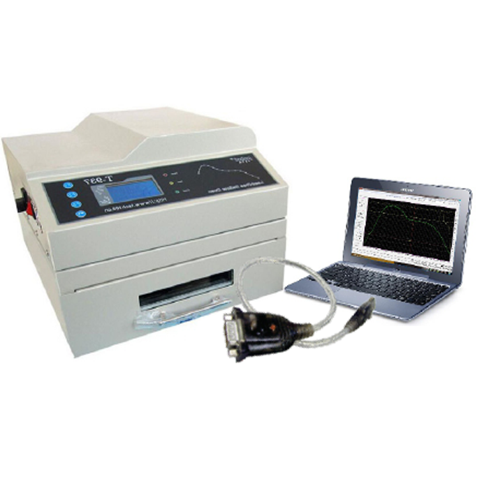 The T-937M Desktop Reflow Oven is a Lead-free (RoHS) Reflow Soldering Station designed for efficient and precise PCB assembly. It features PC connectivity, allowing users to easily input, set, transmit, adjust, save, and manage soldering wave data through intuitive control software with graphical displays. The oven supports multiple soldering curves, ensuring flexibility for various applications, and utilizes advanced MCU and intelligent temperature measurement technology for stable and even heating. With a temperature range up to 350°C, it is suitable for single and double-sided PCBs. Compact and user-friendly, the T-937M is an ideal solution for small-scale production and prototyping.